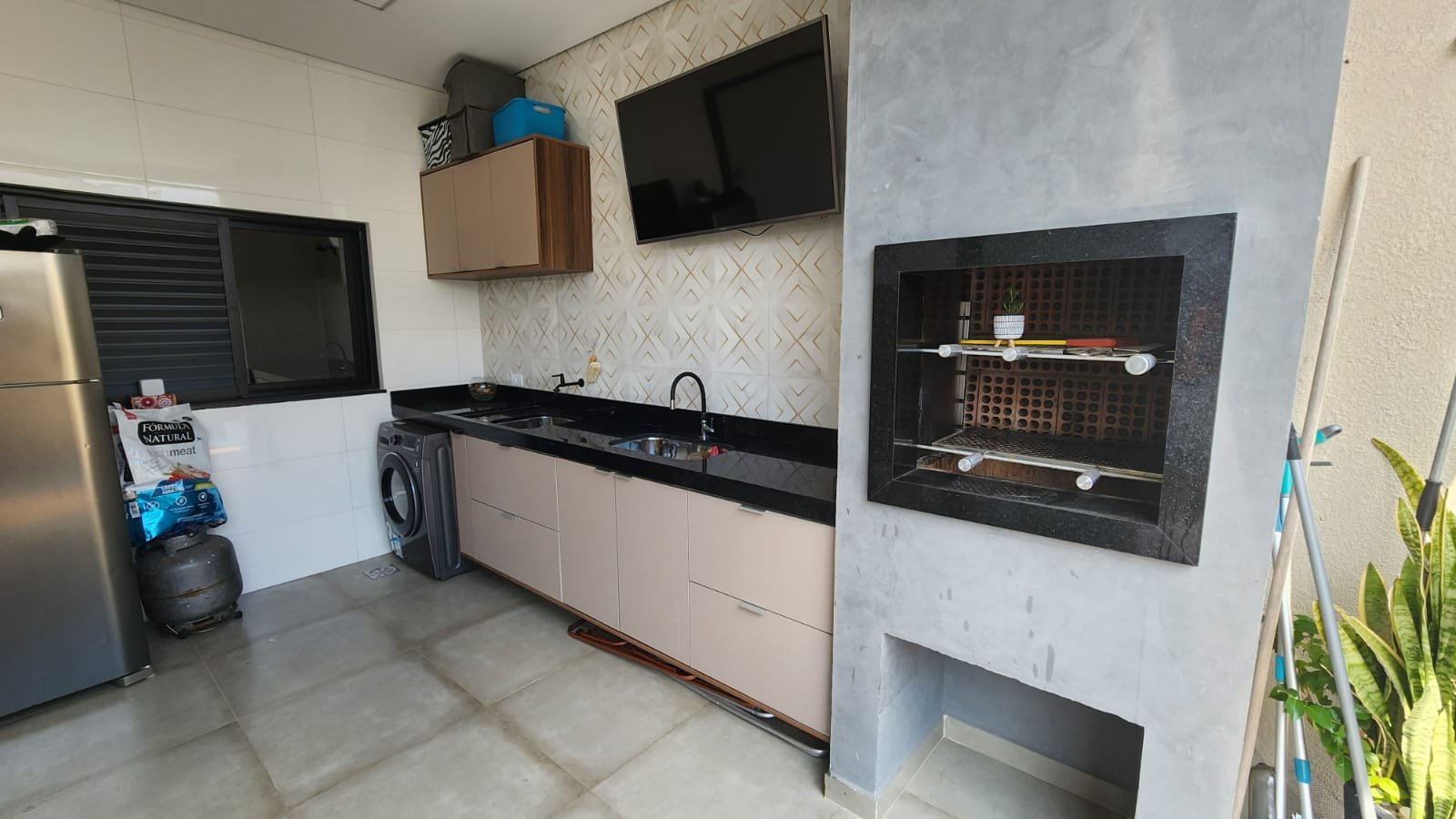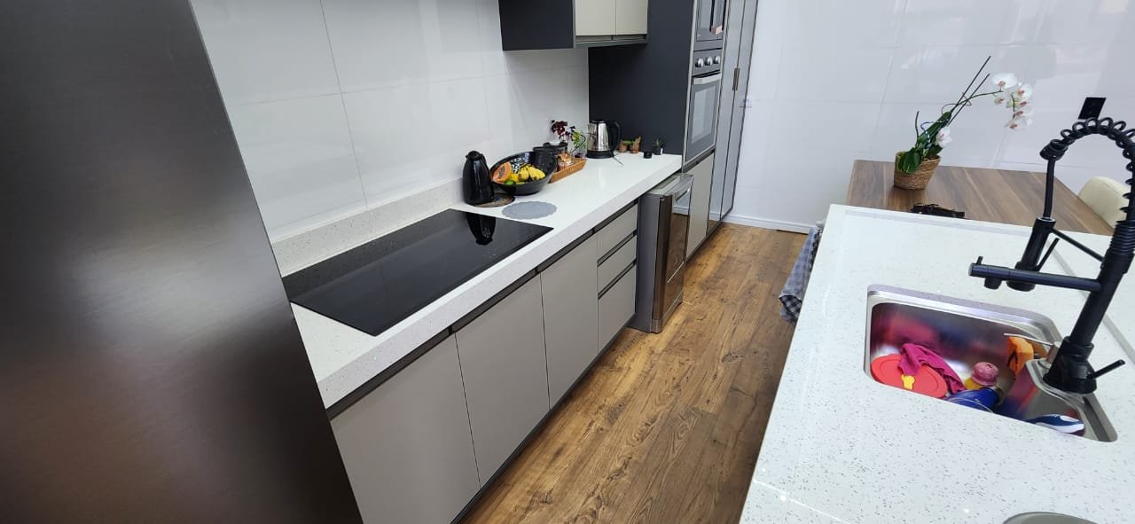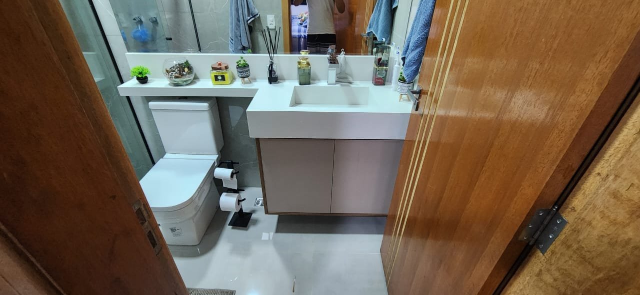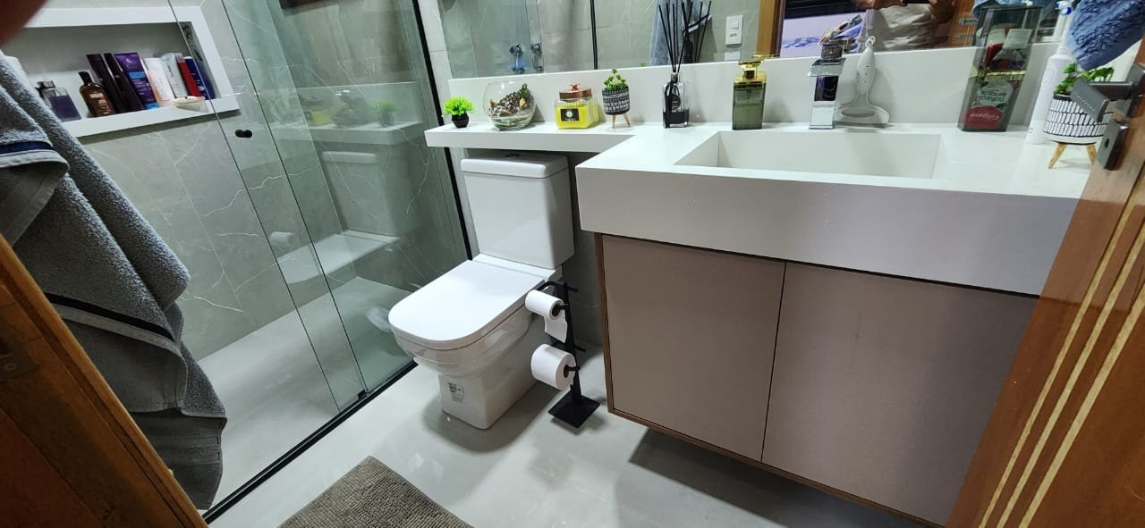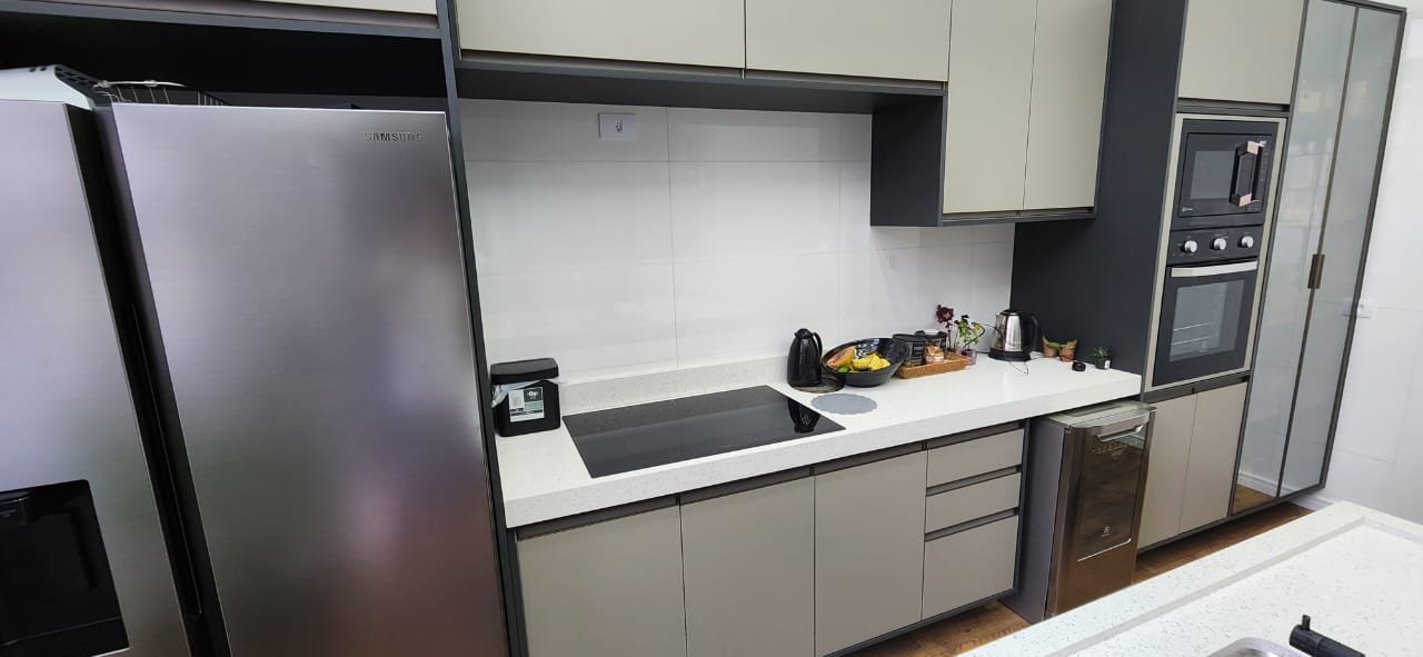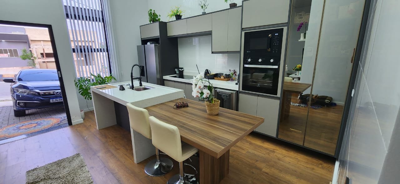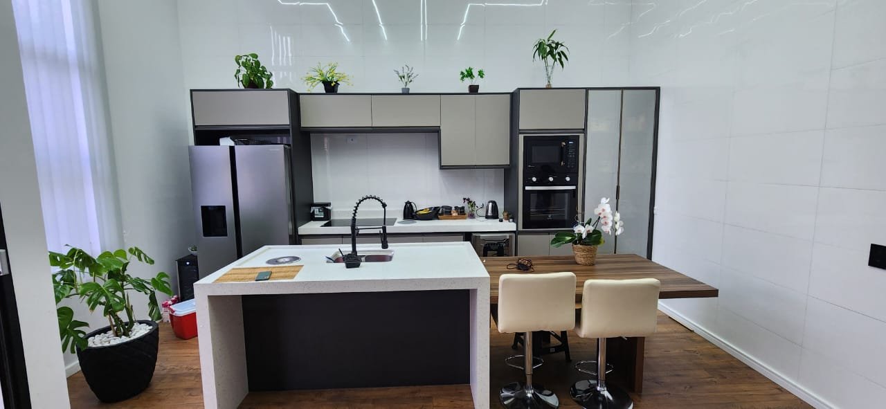 Dois dos quartos estão equipados com ar-condicionado, assegurando um ambiente agradável durante todo o ano. A integração da sala e da cozinha cria um espaço amplo e arejado, ideal para momentos de convivência e lazer. A cozinha é um dos pontos altos da casa, equipada com uma ilha central e balcão em quartzo branco estelar, além de revestimentos em porcelanato delta, que conferem durabilidade e estilo contemporâneo.