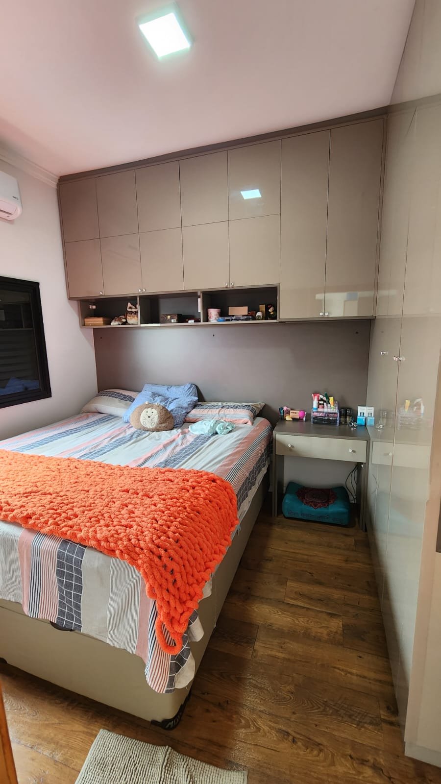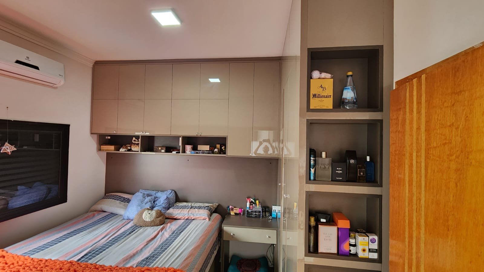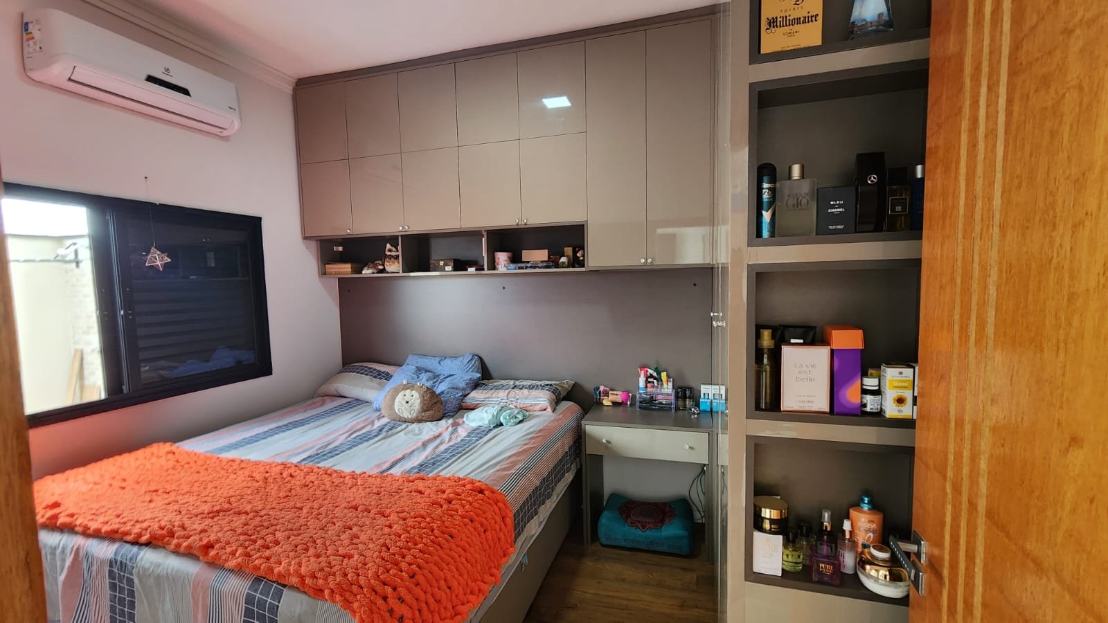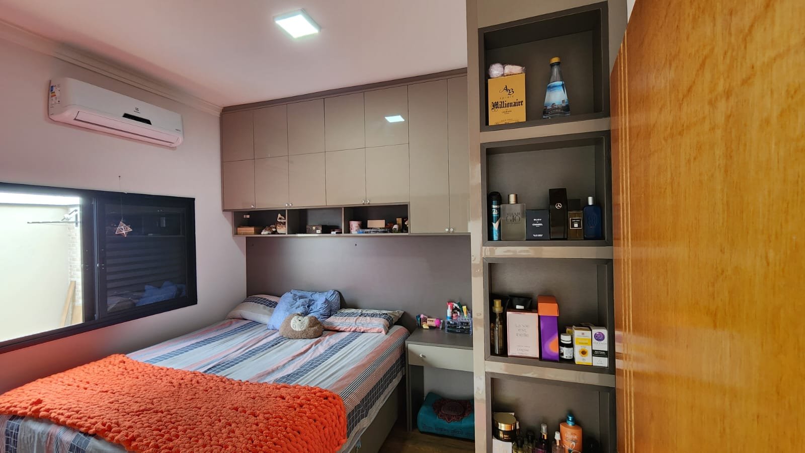 Dois dos quartos estão equipados com ar-condicionado, assegurando um ambiente agradável durante todo o ano. A integração da sala e da cozinha cria um espaço amplo e arejado, ideal para momentos de convivência e lazer. A cozinha é um dos pontos altos da casa, equipada com uma ilha central e balcão em quartzo branco estelar, além de revestimentos em porcelanato delta, que conferem durabilidade e estilo contemporâneo.
