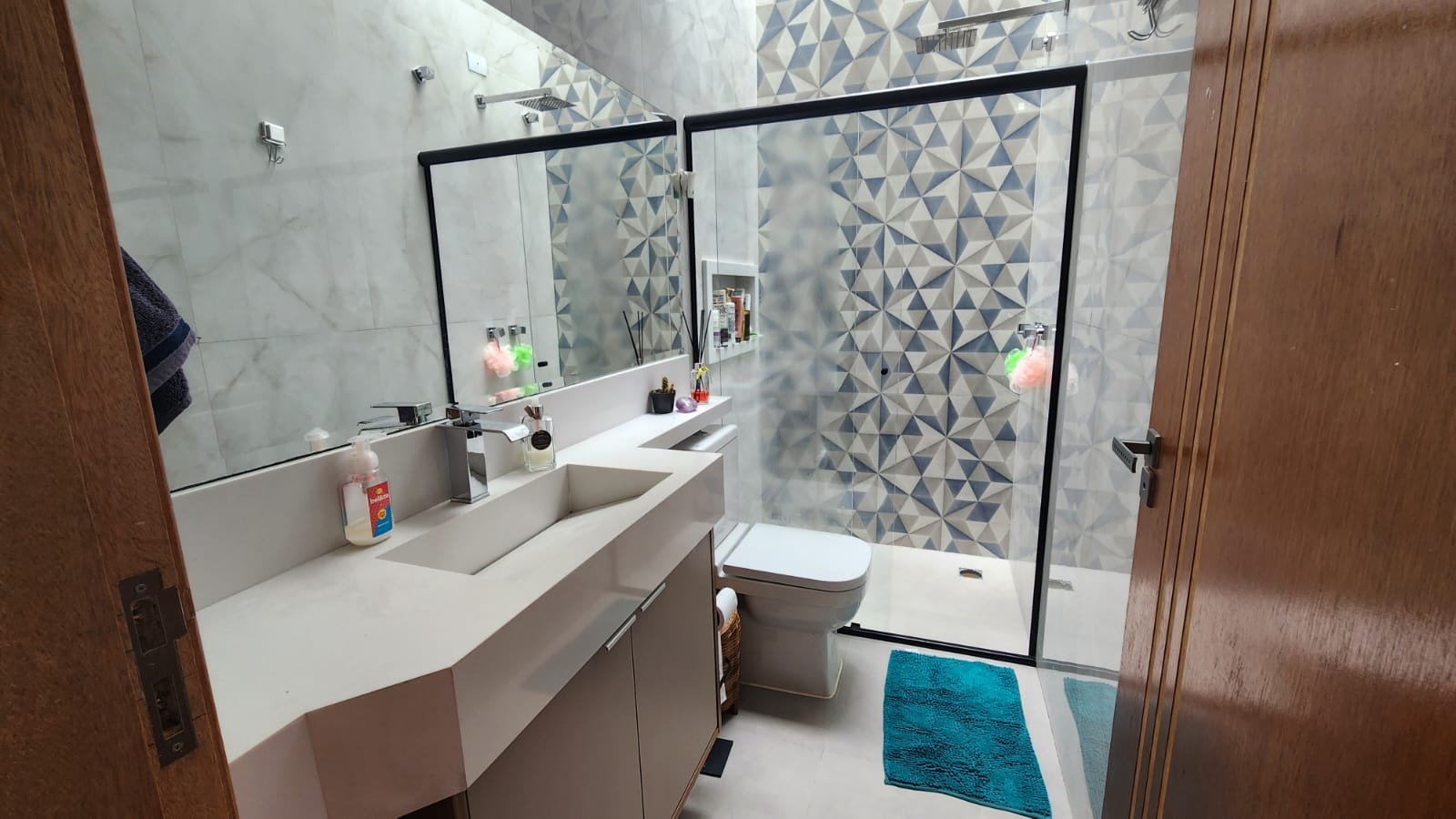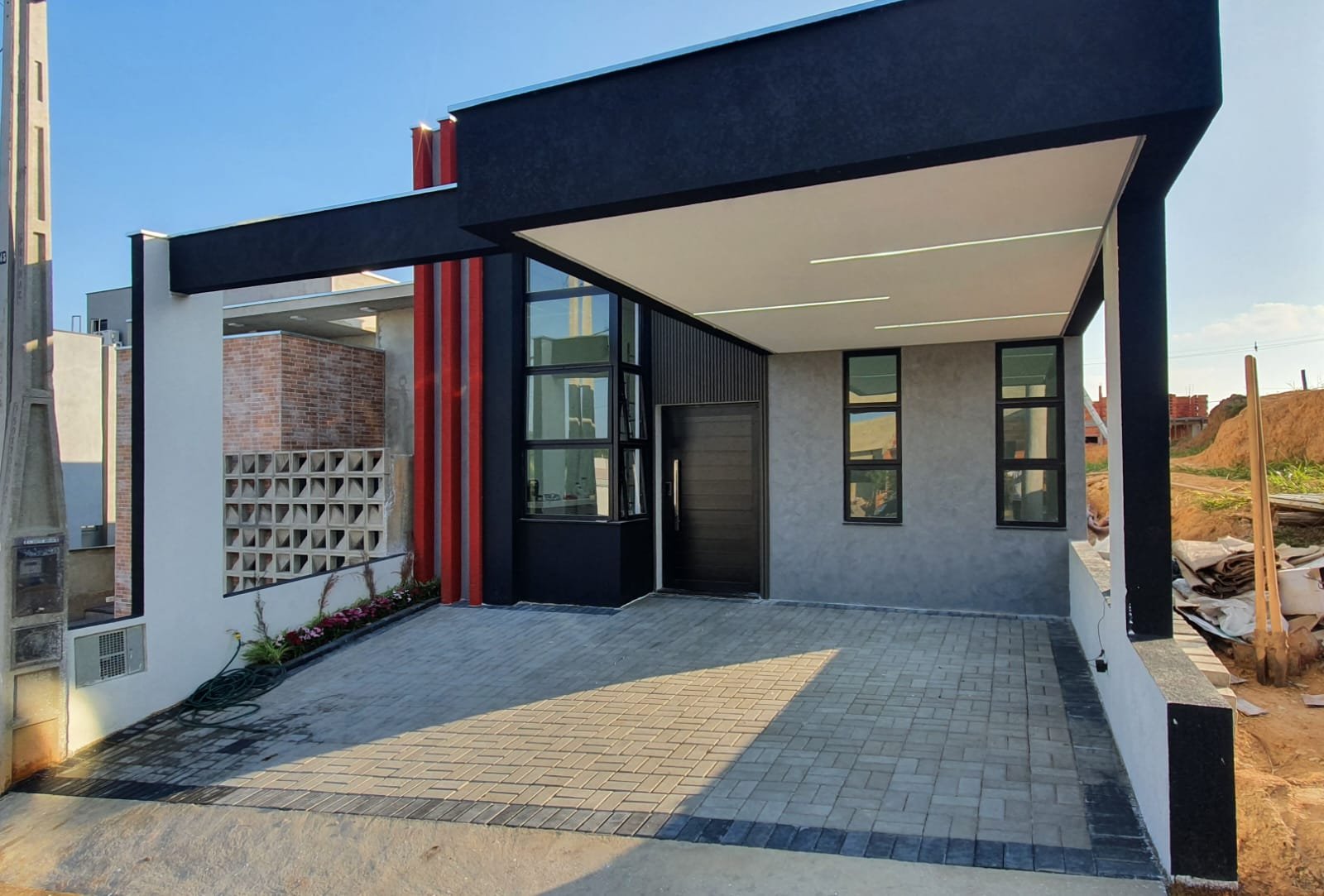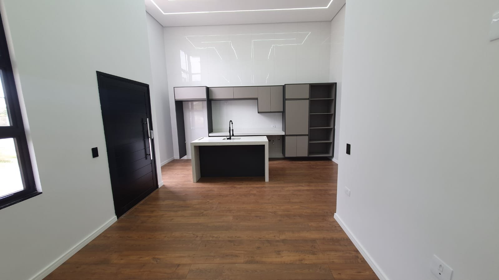 As esquadrias da casa são feitas em alumínio preto linha gold, conferindo um toque de elegância e sofisticação ao design exterior. A porta central da propriedade é outro ponto de destaque, oferecendo acesso por biometria. Essa funcionalidade não só aumenta a segurança, como também agrega um elemento de tecnologia avançada à residência. Os interruptores touch screen da marca Lumenx complementam essa modernidade, proporcionando uma experiência de uso simplificada e futurista.