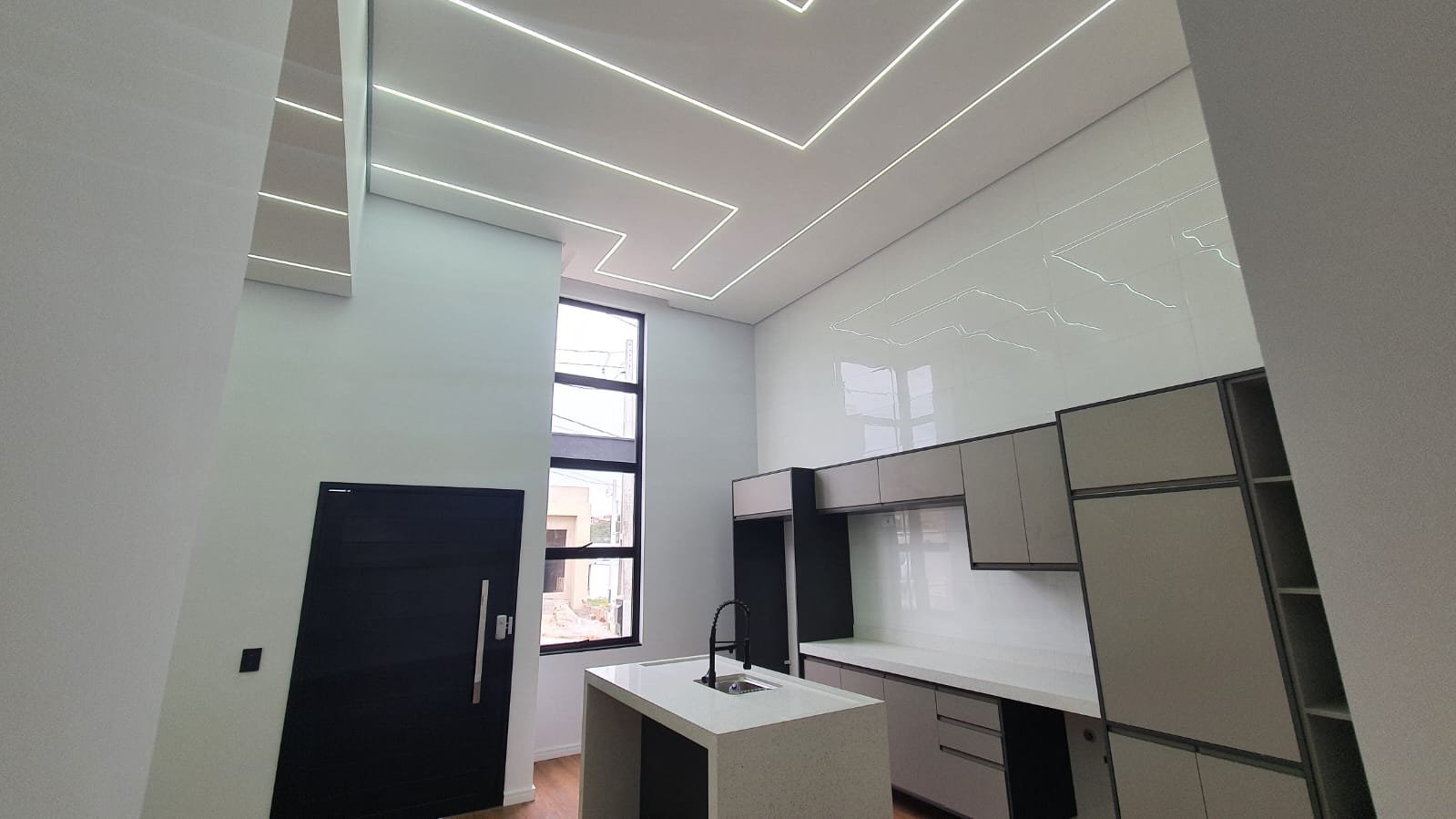 O sistema de abastecimento de água quente é eficiente e sustentável, utilizando um sistema solar com capacidade para 400 litros, proporcionando economia e respeito ao meio ambiente. Toda a casa é revestida com piso laminado resistente à água da renomada marca Quick Step, que combina estética e funcionalidade. A iluminação é cuidadosamente planejada, utilizando fitas de LEDs premium embutidas no gesso, que oferecem uma iluminação suave e homogênea, destacando os detalhes do design interior.