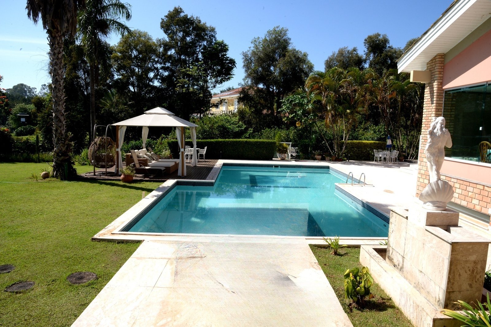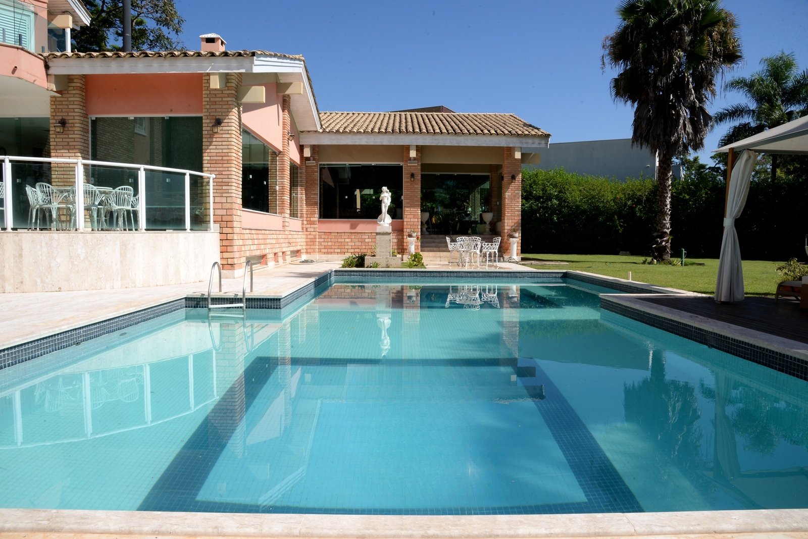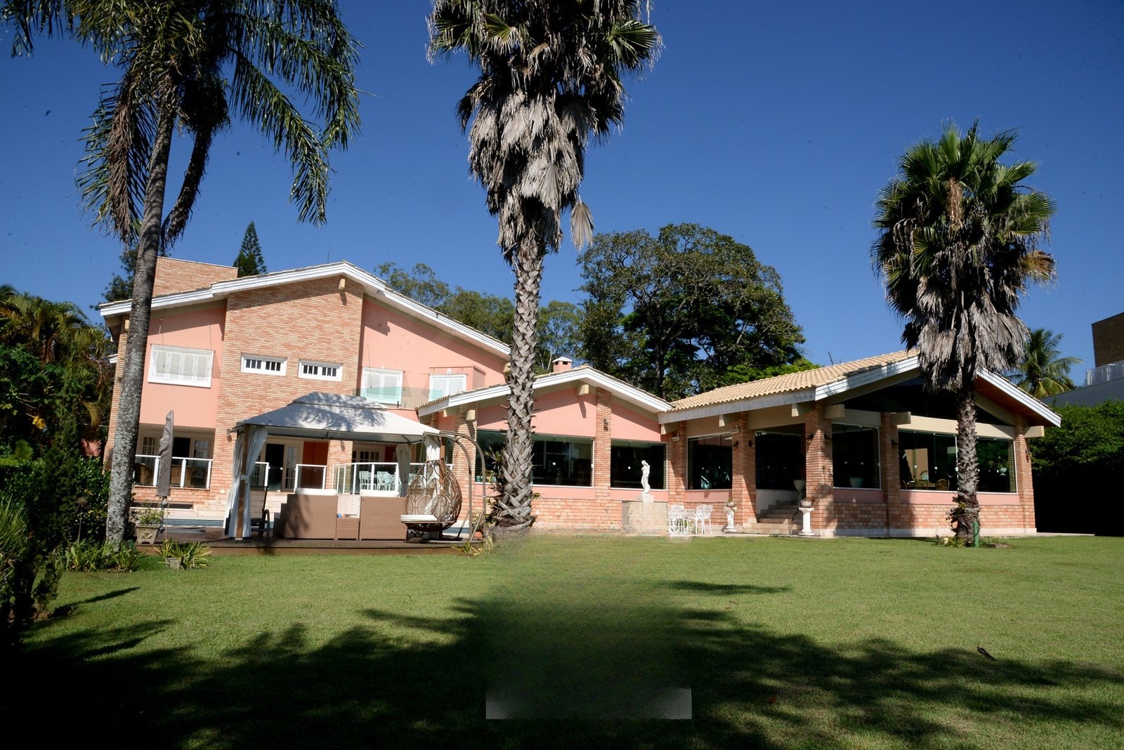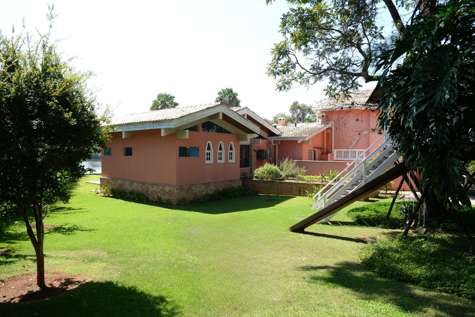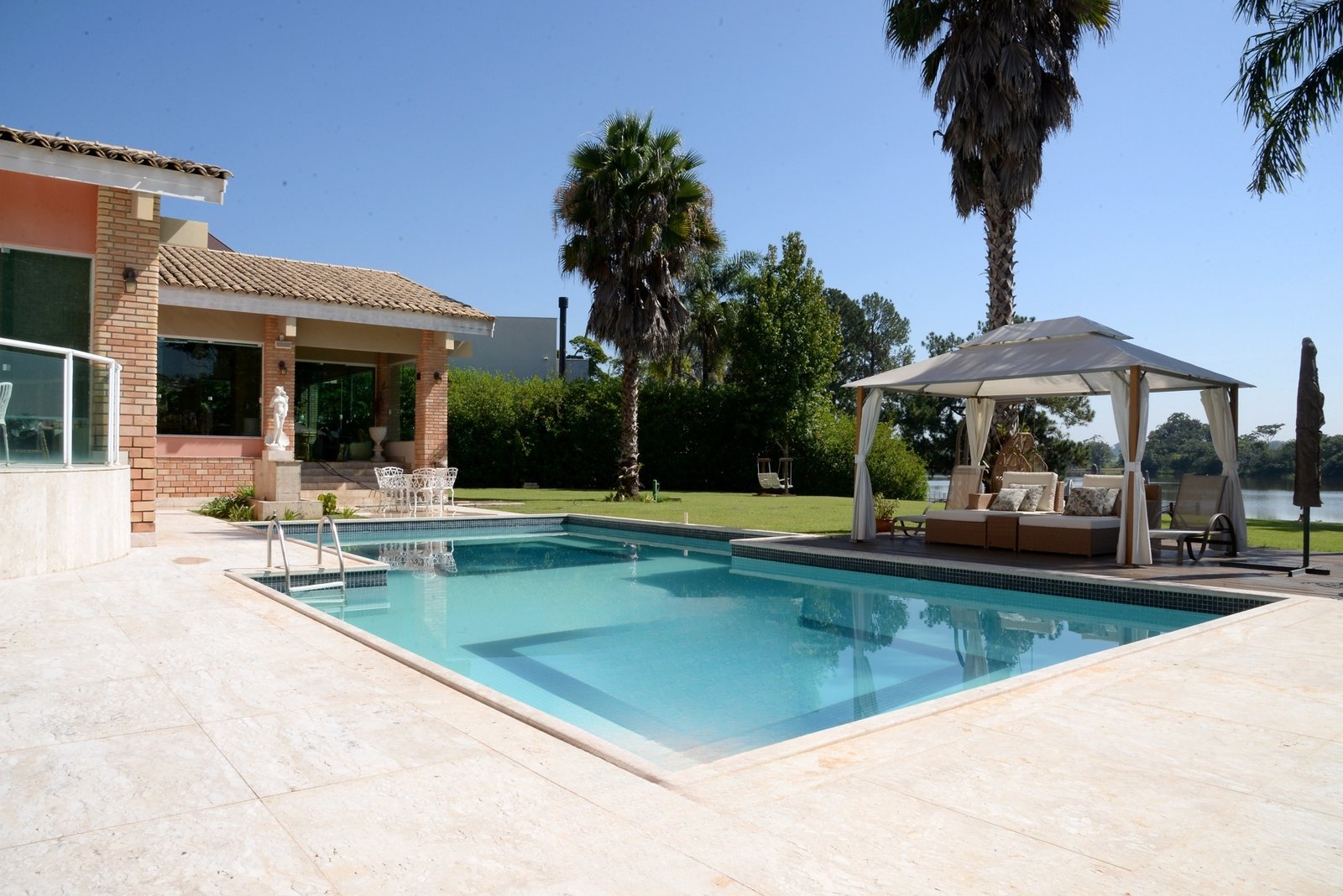 Inserida entre dois lagos, sendo um deles o lago principal do condomínio, o imóvel, com quase 3.000 m2 de terreno e área construída de 1000 m², inspira charme e relaxamento.